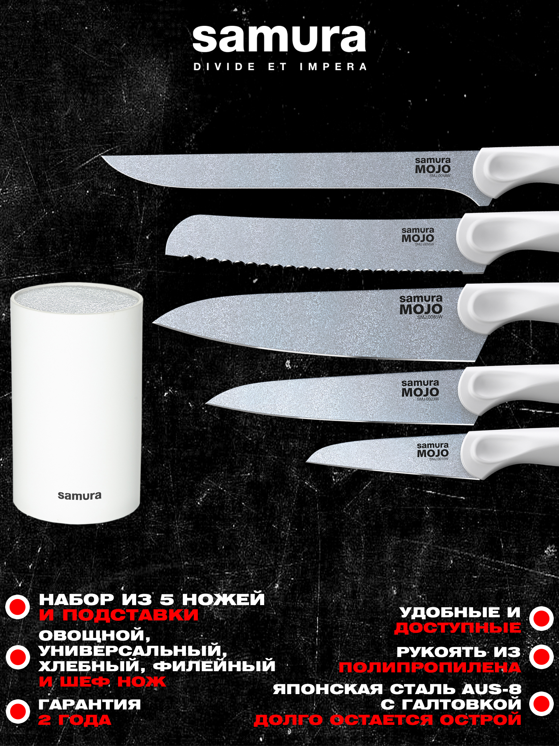 Набор из 5 ножей и браш-подставки "Samura MOJO" 10,23,48,55,85, полипропилен белый,SMJ-06W